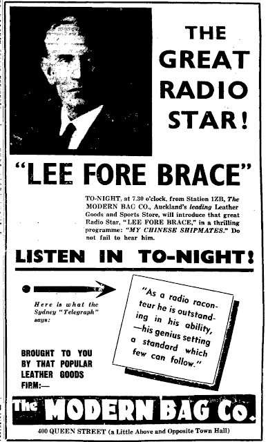 Sea stories form the subject of a series of six talks to be given by "Lee Fore Brace," a New Zealand broadcaster, who is on his way to the U.S.A. to fulfil an engagement obtained as a result of the successful reception of his talks In that country. The first of the series -"The First Voyager"-will be given on Saturday from 2BL at 7.40. The others are: Sunday, 2FC. 7.40 p.m.. "Broached To;" Monday, 2BL, 9.10, "The Sea Devil;" December 10, 2BL, 7.40, "The Sailor Men of Devon;" December 15, 2FC, 9.35, "Looking After the Owner's Interest;" December l8, 8.45, "In the Wake of the Convict Ship." (Sydney Morning Herald, 30 November 1932)