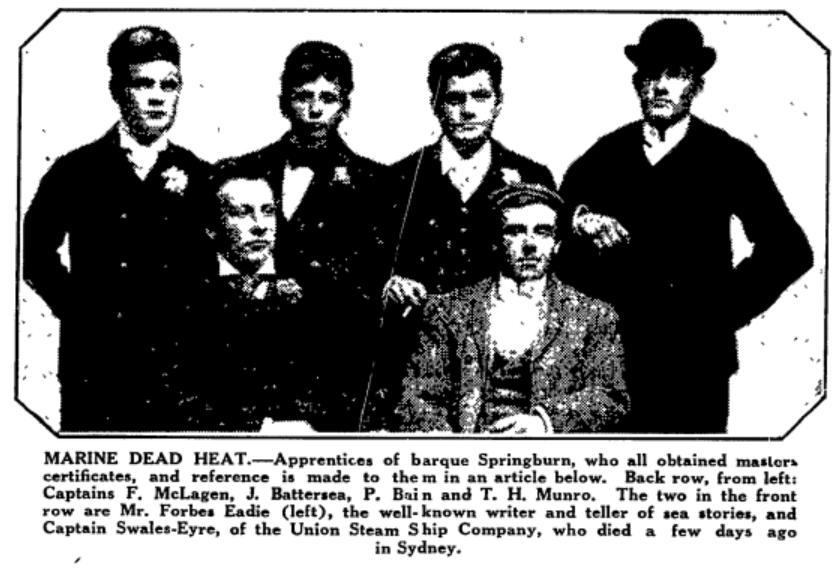 Memories of the barque Springburn and her eventful trips in the days of sail under the famous Captain D. Hunter are recalled by the death at Sydney of Captain W. J. Swales-Eyre, of the Union Steam Ship Company.Captain Swales-Eyre was one of "the hellfire twelve." That was the sobriquet of the twelve apprentices that the barque carried in her halcyon days of the 'nineties. One fine day at Portland, Oregon, six of the twelve decided to vary shore life by getting photographed. The group appears, on this page. In the front row is Captain Swales-Eyre. Now there is only one survivor left —Mr. Forbes Eadie, of Auckland, writer and broadcaster of topics of the sea.All the six apprentices got their master's certificate before reaching 24 years of age, and some of them helped to make history.Captain Frank McLagen was master of the steamer Alcinous when she was sunk by a submarine in the English Channel. Another war victim was Captain J. Battersea, who was in command of the Chinook when she was sunk by a mine. Captain P. Bain added a page to the history of the British mercantile marine when his ship, the Clan McNeil, put up a great but unavailing fight in the Bay of Biscay before a German submarine sank her with all hands.Captain T. H. Munro joined the Navy during the war, and was lost in the battle-cruiser Queen Mary, which disappeared in flame and smoke in the early stages of the Battle of Jutland.Captain Swales-Eyre was the only son of the Rev. W. Swales-Eyre, vicar of York. His last command with the Union Steam Ship Company was the Oonah, on the run between Launceston and Hobart. He was one of the best-known masters of the company, also the original "Yorkie" of the "Lee Fore Brace" sea stories.