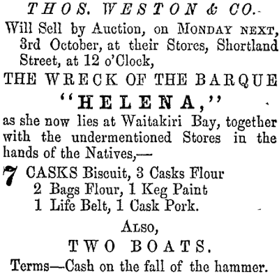 "There was no other body but that of the captain cast ashore. Two boats, some stores, together with several spars, rigging, sails, and a considerable portion of the vessel, have been saved. These have been taken charge of by the natives. The barque Posthumous was to have sailed from Melbourne, for Kaipara, on the 24th ult., the day after the Helena.”