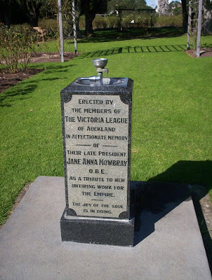 This drinking fountain, in honour of Jane Anna Mowbray (c.1853-1940) is one of the few remaining traces of the Victoria League's activities left in Auckland. The other is the Land Wars memorial in Symonds Street.