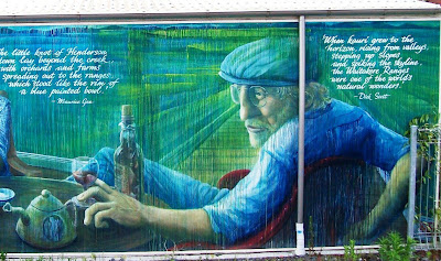 immortalised at Henderson Train Station. The title of the mural is "Going West/ The Titirangi Years", by Douglas Ford (2007). It's on the back wall of a smokers' hut.