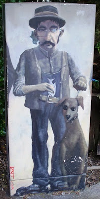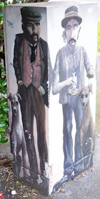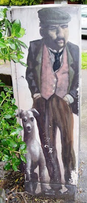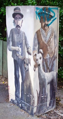 The other is chipped, tagged and faded an intersection away, this one where Ash Street meets Rosebank Road. The dogs' eyes look somewhat spooky ...
