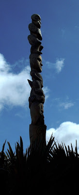 I struck up against very friendly and helpful folk at Glen Eden today. Popping into the library, where this carving stands, I asked a libraian what it's called. She gives me a brochure which not only explains the carving, but other works elsewhere in the complex. And they still have their own local history file collection! Wonderful news, considering my earlier bleat on Waitakere City Library policy.