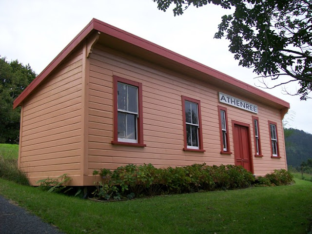 Athenree Railway Station was moved to the Athenree reserve on Athenree Road, just off SH2, the Katikati North Road after it closed in 1978 due to the completion of the Kaimai Rail Tunnel (and therefore no more need to that rail line, or its infrastructure). Sometime later, it was moved to this site. The station building dates from 1919, but it has one of the older Victorian-era designs.