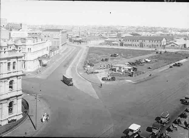 But, times move on. The old dock wasn't all that big, and ships were getting bigger. As well, the Harbour Board had the Calliope Dock on the North Shore, and they wanted to extend their docklands in the vicinity of Hobson Street (ultimately creating Princes Wharf). Despite some grizzles in the press, and a bit of a protest from the NZ Shipowners' Federation, demolition of the old dock, retrieval of the valuable bluestone sides and base for sale by tender, and filling in of the remaining hole proceeded in 1915. It was all over by the end of September that year. The project was one of a number at the time under the direction of W H Hamer.