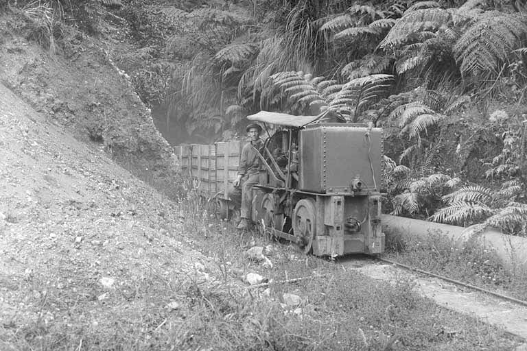 "The Nihotupu tramline and pipe route during construction of the Upper Nihotupu Dam, with locomotive used to haul construction material to dam site," Henry Winkelmann, Sir George Grey Special Collections, ref. 1-W1784,