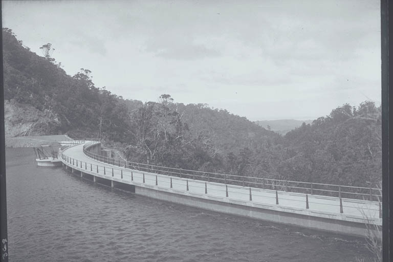 "Nihotupu Dam from the west bank in the Waitakere Ranges", Henry Winkelmann, 31 October 1923, Sir George Grey Special Collections, ref. 1-W368, Auckland Libraries