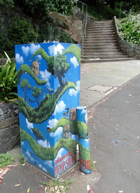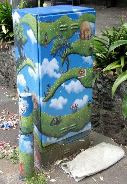 My good friends Bill and Barbara Ellis have done me a great favour by sending through these shots of a traffic control box I keep meaning to photograph myself -- at the base of Albert Park in the city, just at the top of Victoria Street, and close to the (now) sealed off entrance to the WWII Albert Park tunnels. Thanks, folks!