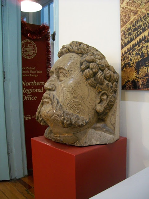 The Museum has three gargoyles, NZHPT one (on an uncut block). Above are two of the Museum's gargoyles -- the top misidentified as Hone Heke. Why, I just don't know ... perhaps because of the tongue sticking out? Could just as much be some cheeky larrikin. The identification, without evidence, is dubious.
