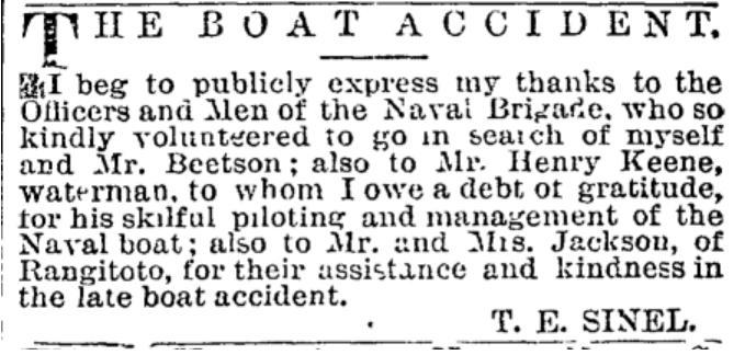Over the years from that point, "Rangitoto Jack" popped up in reports from time to time, usually in relation to finding dead bodies in or near the Rangitoto waters, and bringing them in to the mortuary. At least the 1878 Sinel-Beetson accident ended fortunately.