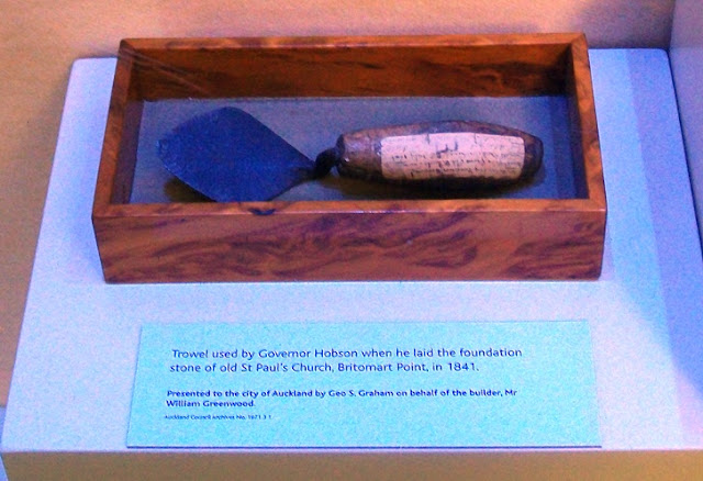The most intriguing of all: "Trowel used by Governor Hobson when he laid the foundation stone of old St Paul's Church, Britomart Point, in 1841. Presented to the city of Auckland by Geo. S Graham on behalf of the builder, William Greenwood."