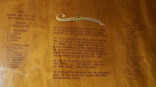 Saunders may have purchased the timber direct from the company -- and probably used a fair bit in the course of his trade. There may even be the remains of coffins at Waikumete Cemetery made from the wood of that same tree. This remaining piece measured 13ft 10 inches long by 7ft 4 3/4 inches wide when donated. Initially, Council considered incorporating the board in the vestibule of the Pioneer Women's Hall, Freyberg Place. But, as with other items offered to the Council, such as stone sculptures from off old Post Offices, this was stored "for the time being" at the Town Hall. Probably due to its dimensions, it never left.