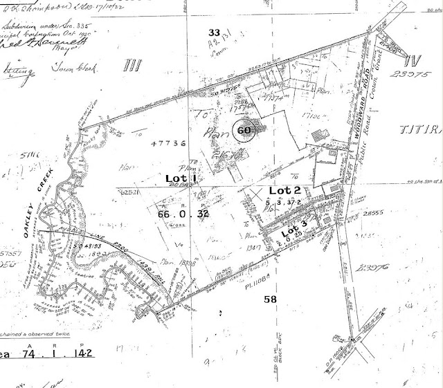 The belief by some descendants that Mark Woodward obtained the property from John Logan Campbell (as published by the Mt Albert Historical Society in their newsletter dated Oct/Nov 2008) cannot be proved by documentation, but may be possible. In June 1873, auctioneers Samuel Cochrane & Co were instructed to sell the two Adam Estate farms, Lot 54 and Lot 60. (Auckland Star 5 June 1873) These sold on 9 June, Lot 60 to Mark Woodward for approx £718 (84.5 acres, at £8 10s per acre). Lot 54 went to Henry Lees – but his title (NA 8/86) shows the previous owner as John Logan Campbell: from June 1874, a year after the auction. It sounds like the auction came first, perhaps after Campbell had offered J S Adam’s agents in New Zealand a price for both farms – then arrangements were made for a retroactive title later.