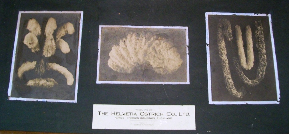 Products from the Helvetia Ostrich Company. Display from Franklin Historical Society museum, Pukekohe.