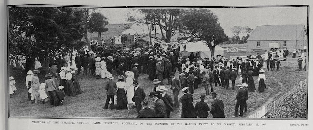 … which Massey and fellow MP Frederic William Lang, along with Messrs C Shepherd, R Bilbey and John Schlaepfer would have benefitted from when they took over the Helvetia Ostrich Farm Company from the Nathans in May 1908. (Feilding Star, 11.5.1908) The garden parties became a regular party political fixture.