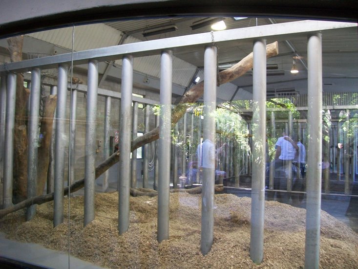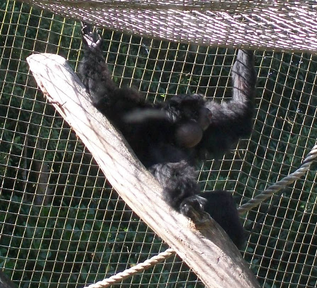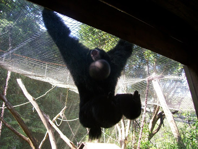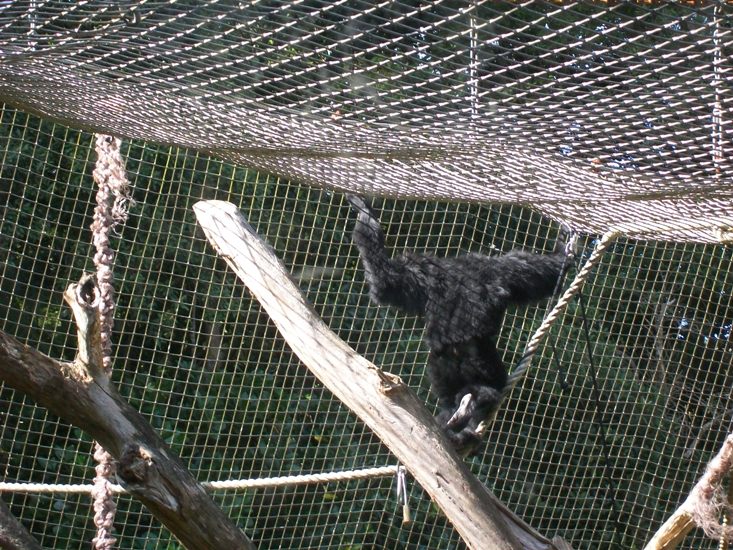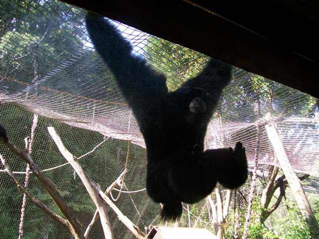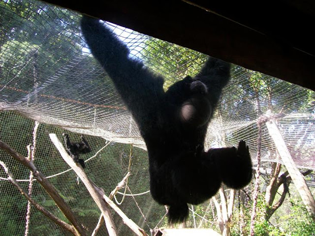 Just as I got a place to try a shot for one of the Siamangs, this one decided to be a bit of a star. Bang! against the window. After a bit of a hoot, he swumg off.
