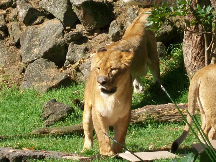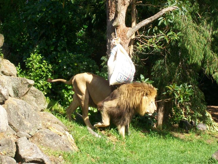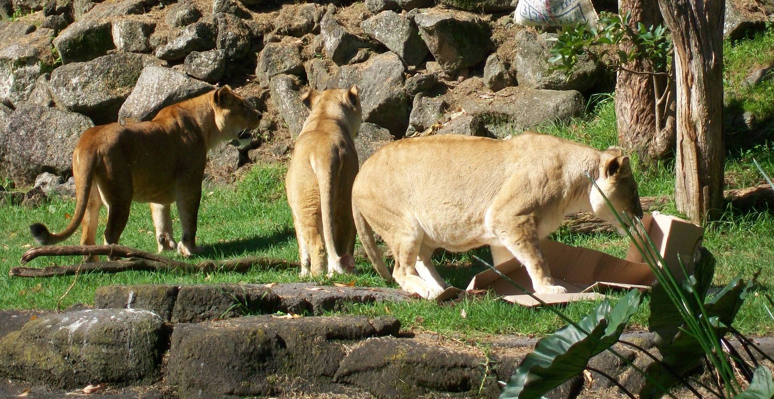 So, lions released, keeper over on the other side of the moat with us, and yes -- the rhino piddle-soaked box is top of the pops with the lionesses.