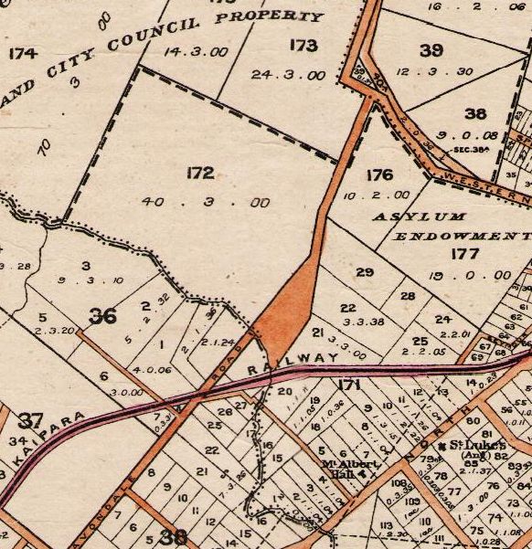 Western Springs Road, following the ridge by Fowlds Park, although surveyed by Elliott in the 1840s to 1850s (SO 1262), appears to have only become reality when A K Taylor created his first Morningside subdivision, “Albert Park”.