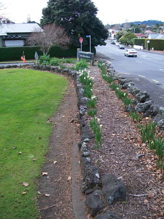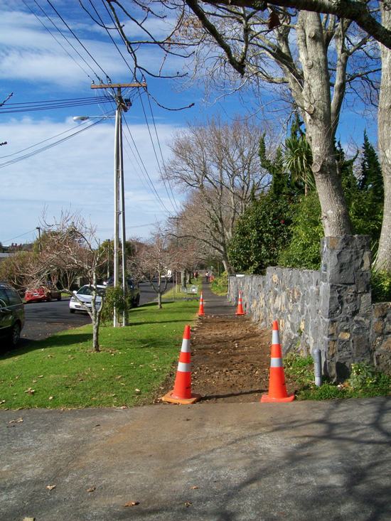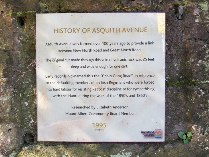 One of those lapses is Scott’s story about Asquith Avenue as being a “chain-gang road”, formed by Irish army deserters in the early 1860s. The story has permeated Mt Albert local history since his first edition in 1961, was perpetuated in bronze by the Mt Albert Community Board in 1995, included in the first newsletter of the Mt Albert Historical Society and essentially repeated as true in the recent Owairaka-Mt Albert Heritage Walks brochure by Carron Boswell, also funded by Eden-Albert Community Board in 2010, and published early 2011. But – I doubt the veracity of the story of the “chain-gang road”. Looking into the story behind the cutting that goes through the scoria lava flow has been for me, over the past few days, much like the chipping away of the rock with pick axes and other tools undertaken by the roading contractors of the day.