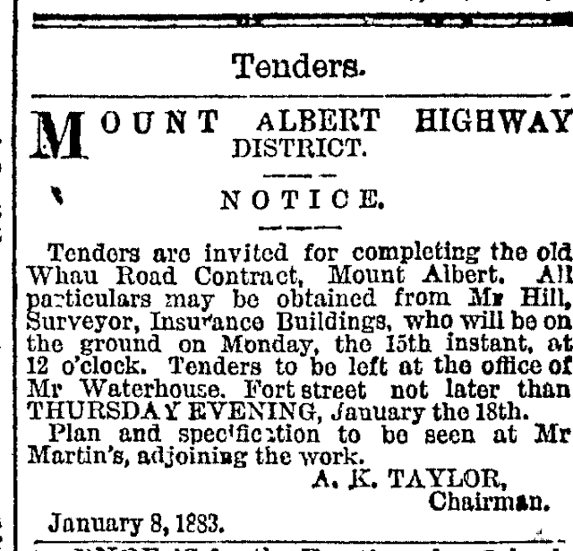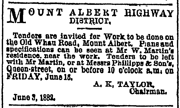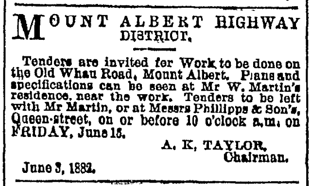 On 5 May 1882, the Board discussed whether it was necessary or not to employ a surveyor. They visited the site on 9 May, and decided to employ Mr Hill in that role (a man with an apt name for the task). Tenders for the task of forming the Old Whau Road were then advertised in June, with Martin offering a sweetener (considering he had a lot to benefit from the work) of providing and spreading scoria ash on the road on satisfactory completion.