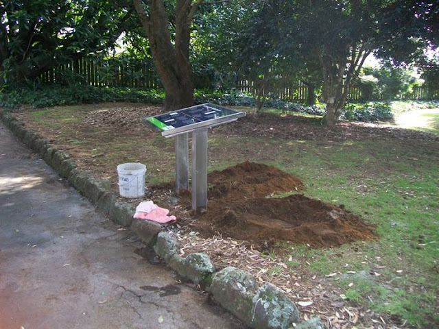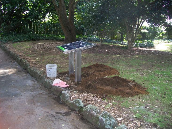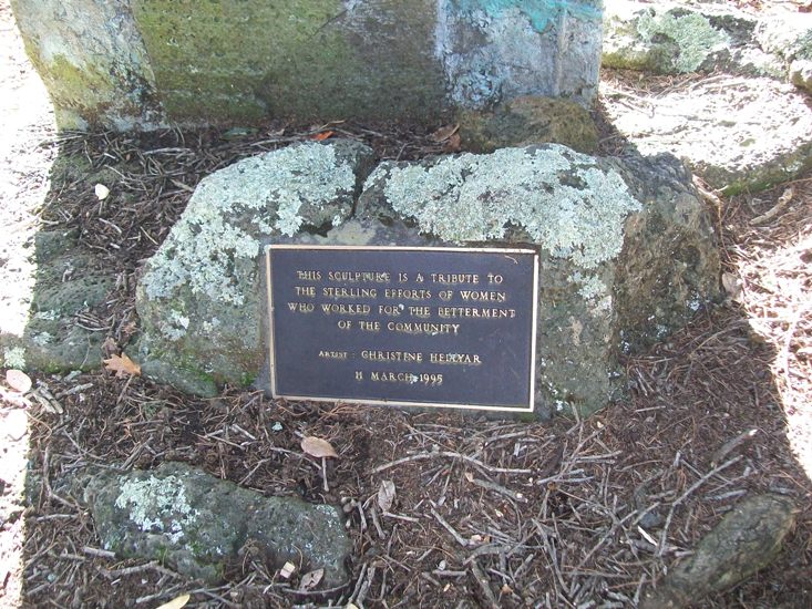 The brass plaque beside a Council-provided seat facing the Plant Barn nursery was stolen after installation in 1995, and a replacement (not brass) installed in late 2011, complete with historical and other errors.