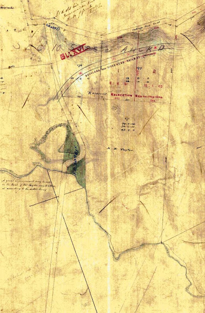 Detail from SO 1262, LINZ records, showing Elliott's early survey of the lines of Asquith and Western Springs Roads. Written beside the area of the deviation around the height of the scoria outcrop: "A great improvement may be made in the Road if Mr Taylor would allow it according to the dotted lines." In the late 1850s, A K Taylor owned land on both sides of the future cutting, but sold Allotment 172 (to the left) in 1861. This eventually came to be W H Martin's land from 1881, the year before the Old Whau Road contract began.