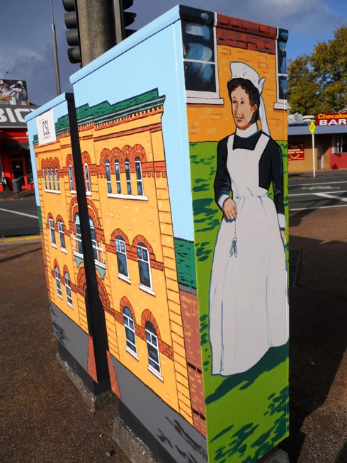 These photos from the corner of Carrington and Great North Roads in Pt Chevalier were taken by Leigh Kennaway (thanks very much for the permission to put them here, Leigh!) Showing the main part of the old 1867 asylum building (now UNITEC's Building 1), plus some images of nurses taken, most likely, from Auckland Museum collection images -- I reckon this is great. Pt Chevalier isn't ashamed at all about its connections with the hospital, and this is showcasing heritage in a very public way. Well done!