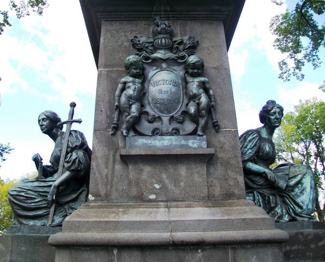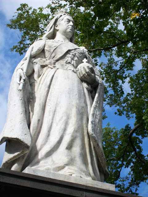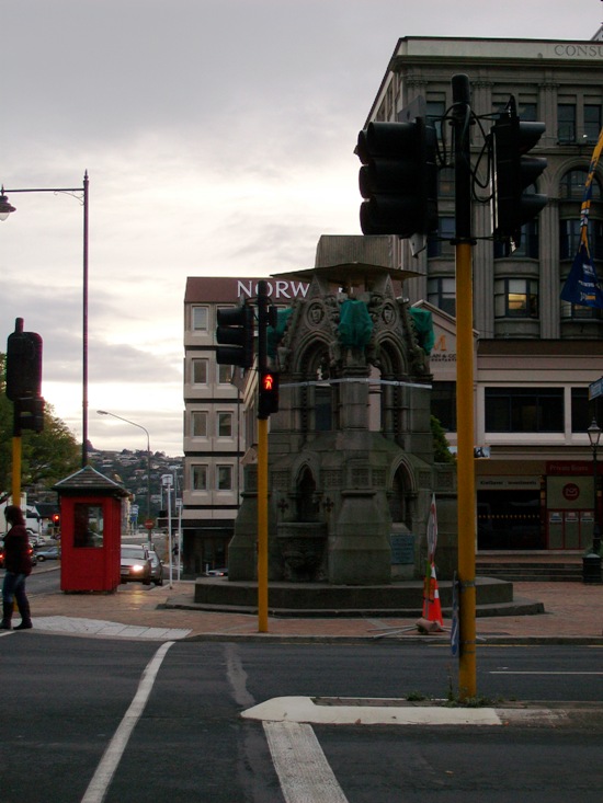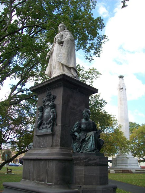In the Queen's Garden reserve, this statue in memorial to Queen Victoria, soon after her death. The reserve, close to the Toitu Otago Settlers Museum, was originally just The Triangle. After the laying of the foundation stone of this statue by the Duke of York (also Prince of Wales) in 1901, the reserve was renamed Victoria Gardens in 1904. The statue was unveiled by Lord Plunket on 23 March 1905. The reserve eventually became known as Queen's Gardens. (Source: Otago Cavalcade 1901-1905, p.112, by Hardwicke Knight. The Otago Cavalcade books, seven in all, are among my favourites, and a great way of learning some general history of Dunedin and greater Otago. I found six of them at the Otago Daily Times office.)