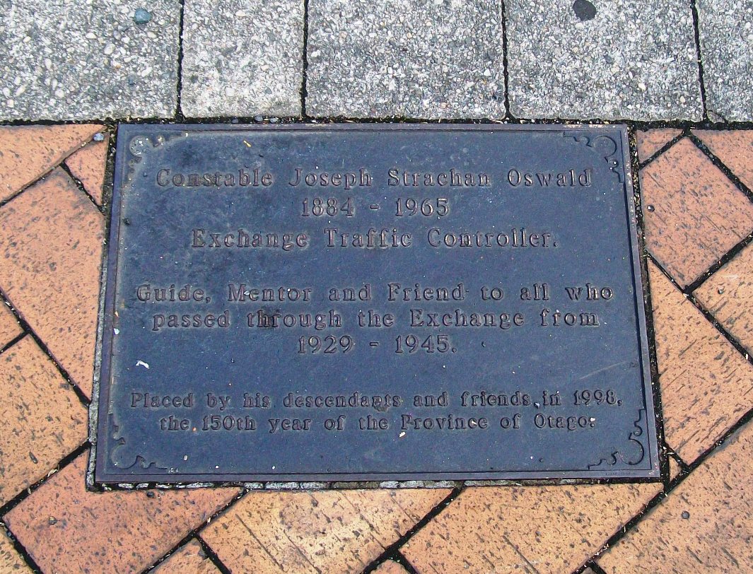The Exchange at the intersection of Princes and High Streets in Dunedin was a busy place in the 1940s. Anyone serving there day in, day out earned their quid. Today, set into the pavement of what is now Exchange Plaza, with the Cargill monument and the penguins (see previous post), is this plaque, in memory of one such man.