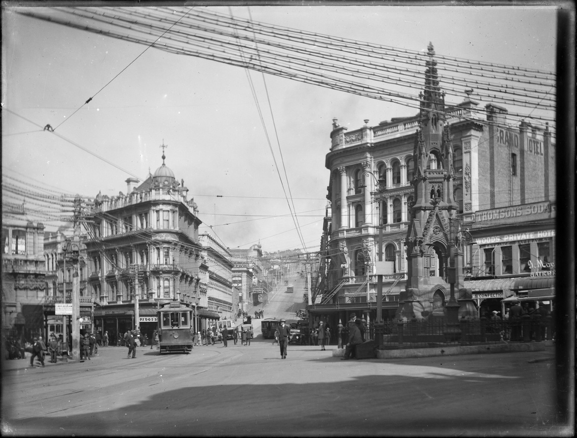 View of The Exchange, Dunedin, with city traffic. Shows cars, trams, and