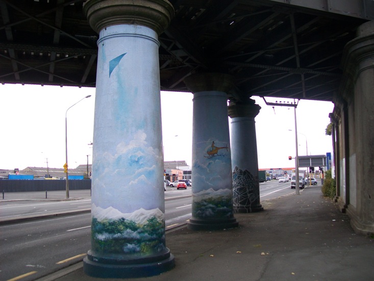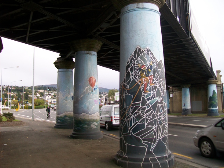 At this point, I nearly got myself lost in a strange city. Fortunately, Dunedin's I-Site folks have a great little street map with attractions and such which every tourist in Dunedin should have. I had mine with me, and was able to navigate (eventually, after a wee period of worry) back towards the wharf area. However, my misguided route took me past lovely murals painted on the pillars of a rail overbridge on Anderson's Bay Road.