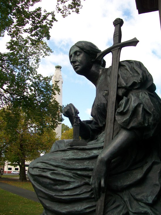 a motorcyclist. The Cargill monument is on the left. Photograph taken
