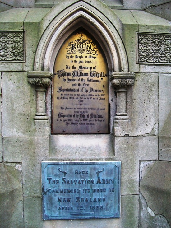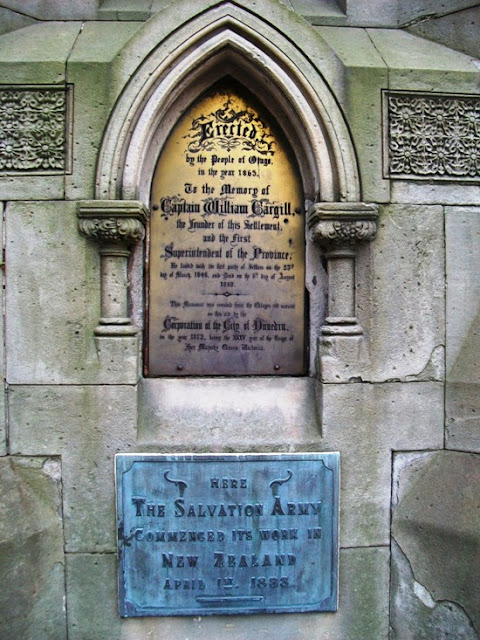 I found it interesting that a plaque is attached to the monument to Cargill about the Salvation Army's commencing their work in New Zealand on 1 April 1883. They apparently assembled at Cargill's monument in the afternoon before a service at the Temperance Hall, "sang several hymns and spoke a few words to the considerable number of people which assembled," with Captain Pollard accompanying the singing with a concertina. (Otago Daily Times, 2 April 1883)