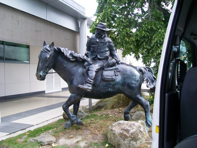 The first photo I took during the Dunedin trip earlier this month -- the Speights "Southern Man" sculpture at Dunedin airport (photographed from inside the shuttle bus, because I'd got in, strapped up ... and then realised there was a cool object to photograph. So I carefully leaned sideways ...), which is utterly cool and a fantastic work of art. Reportedly 1.2 tonnes, 3 metres high and cast in bronze, it dates from 2000 and is the work of artist Sam Mahon. It is apparently the largest equestrian sculpture in the country. More images here.