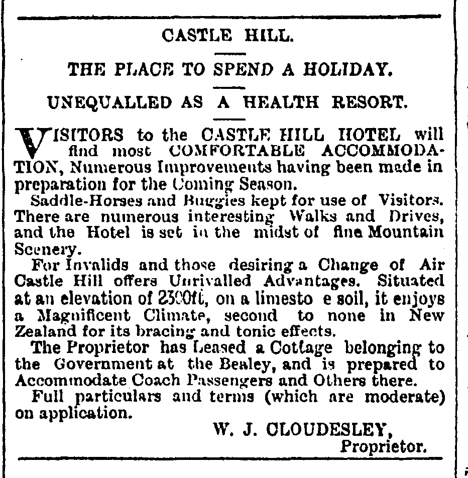 W. Kinnedy, Photo. Cloudesley's hotel, Castle Hill. (New Zealand