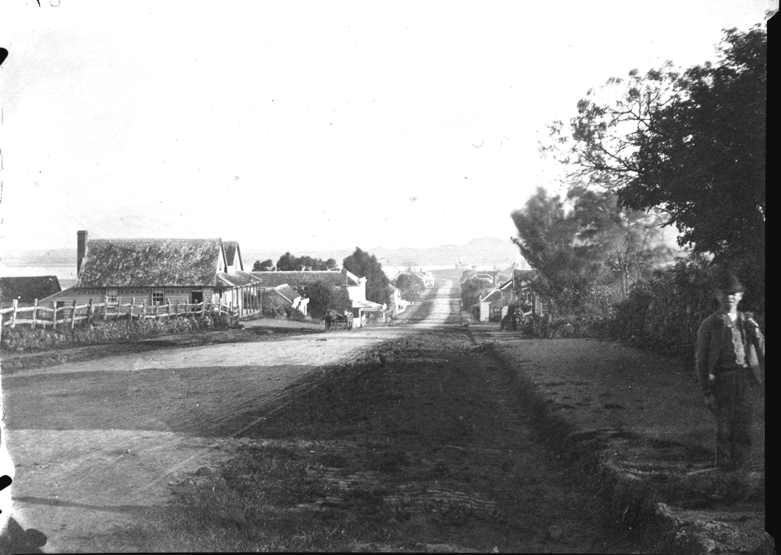 The Prince Albert Hotel, Queen Street, Onehunga (left), 1878. Image taken looking south toward the Manukau Harbour. Reference 4-1384, Sir George Grey Special Collection, Auckland Library.