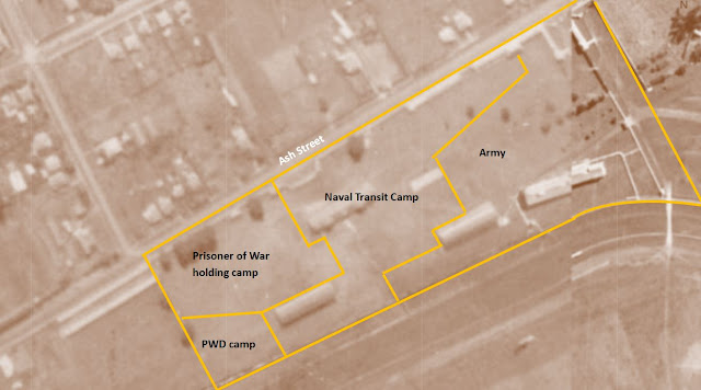 Overlay of the camp areas, on 1940 aerial of the racecourse.